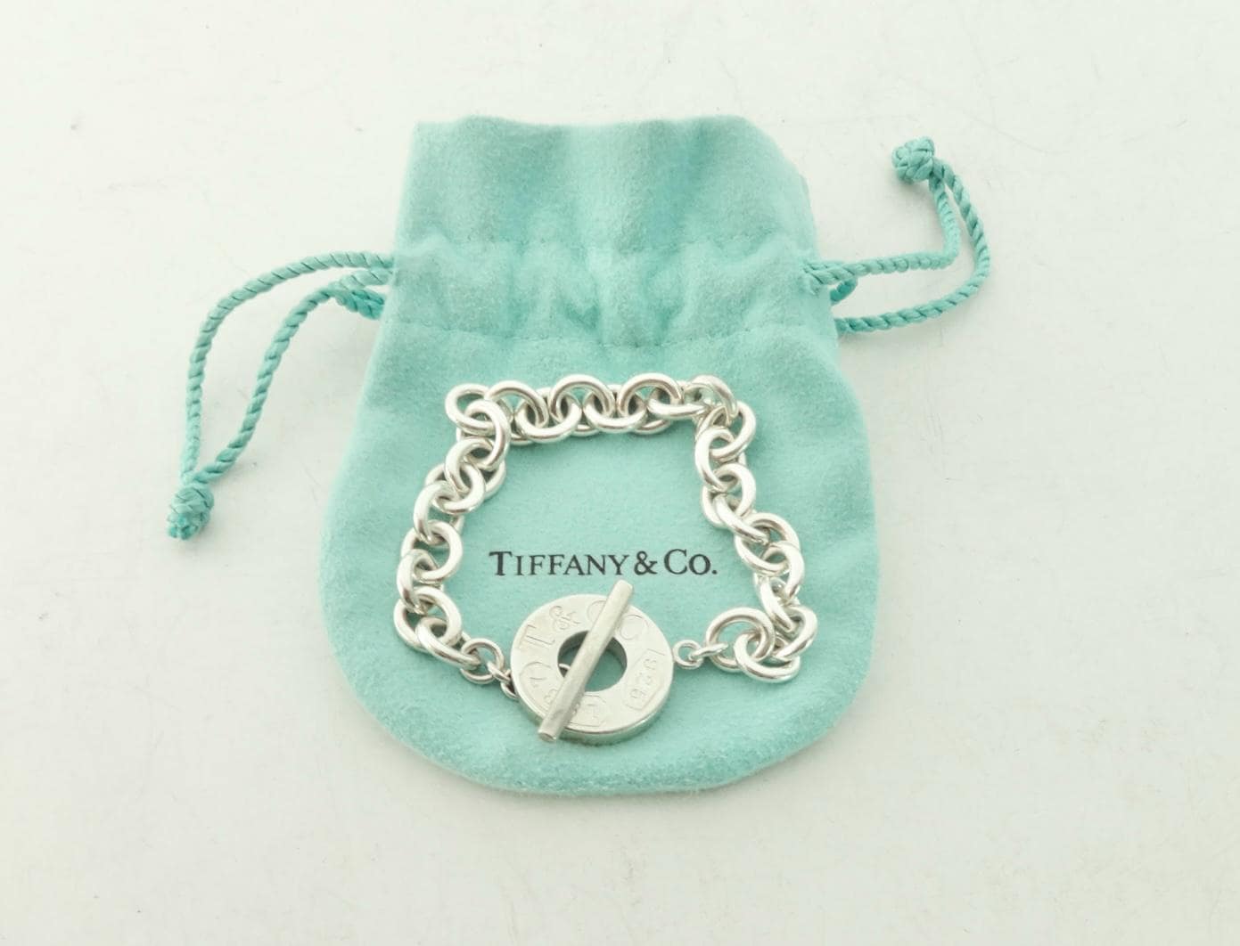 Authentic Tiffany & Co. 1837 sterling silver link toggle clasp bracelet, approximately 7.5 inches long when unclasped, with a shorter wearable length. The bracelet is made up of a round silver toggle clasp marked on the front T&CO 1837 925. The back of the round part of the clasp is hallmarked Tiffany & Co. 925. The bracelet measures approximately 7.5 inches long unclasped and would fit best on a 6.25 inch or smaller wrist. Comes in the blue Tiffany pouch pictured, Tiffany box available at additional cost. Very good condition, see pictures of actual item. If you have any questions, please ask. Thank you.