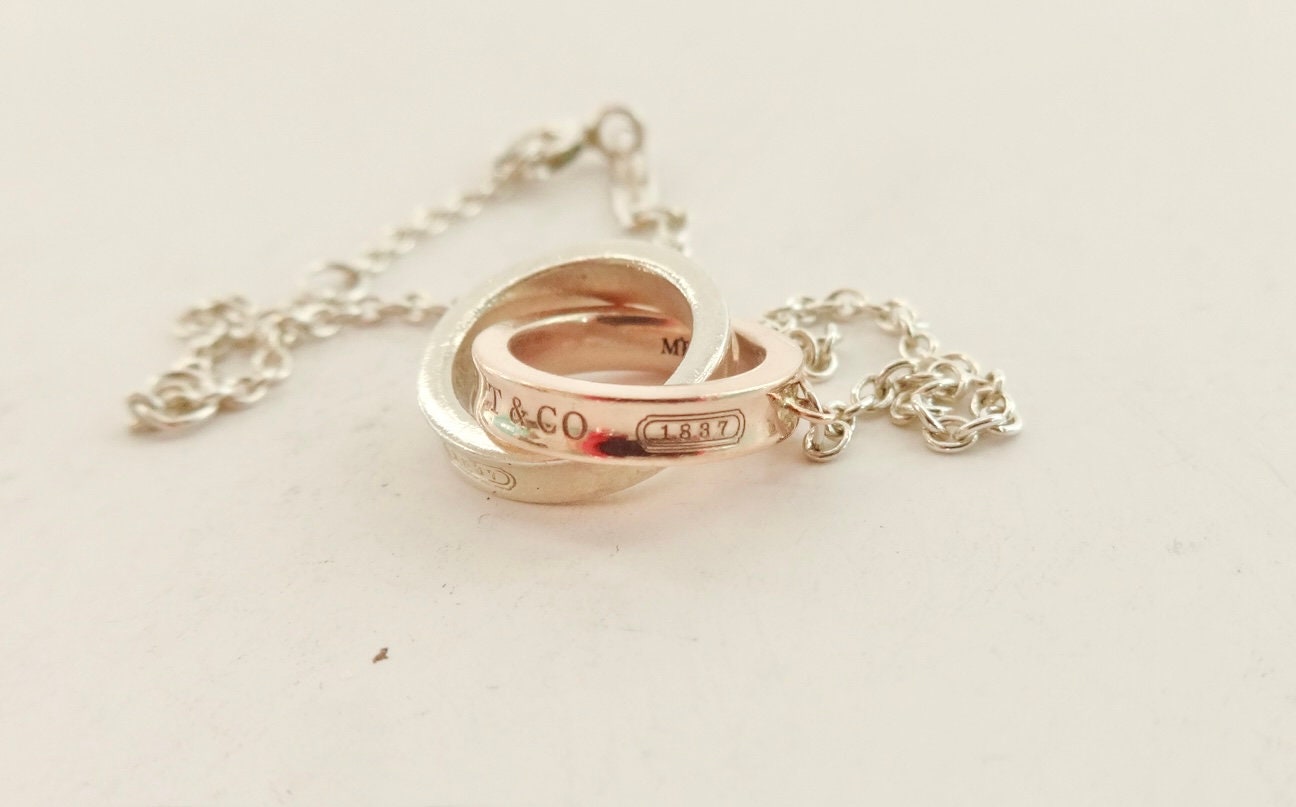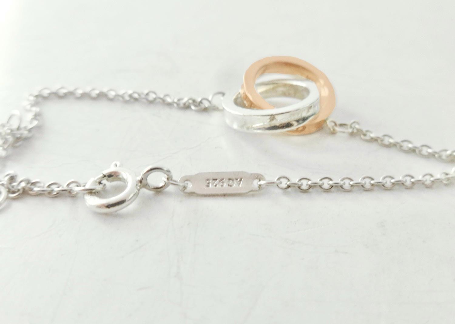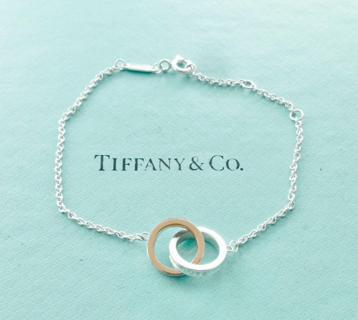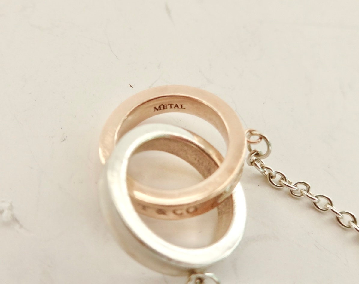 Authentic Tiffany & Co. sterling silver Rubedo interlocking circles pendant adjustable size bracelet. The bracelet consists of two interconnected round rings, one is silver the other is Rubedo, and they each measure approximately 1/2 inch across. On the edge of the silver ring it's marked 925 T&Co 1837. On the edge of the Rubedo ring it's marked NY T&Co 1837, the inside of the ring is marked Metal. The bracelet is adjustable, in that it has three different locations to attach the clasp. The sizes are 5.75 inches, 6.25 inches and 6.75 inches long. The bar on the chain is marked @Tiffany & Co. on one side and AG925 on the other side. Comes in the blue Tiffany dust bag pouch pictured, Tiffany box available for an additional fee. Very good condition, see pictures of actual item. If you have any questions, please ask. Thank you.