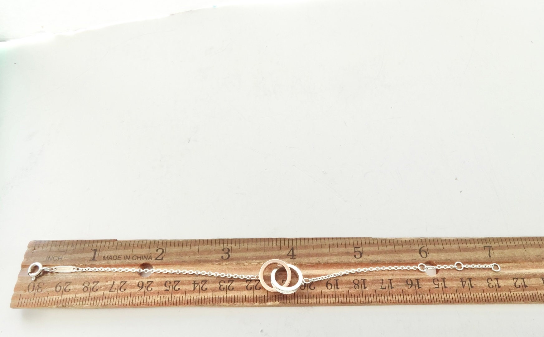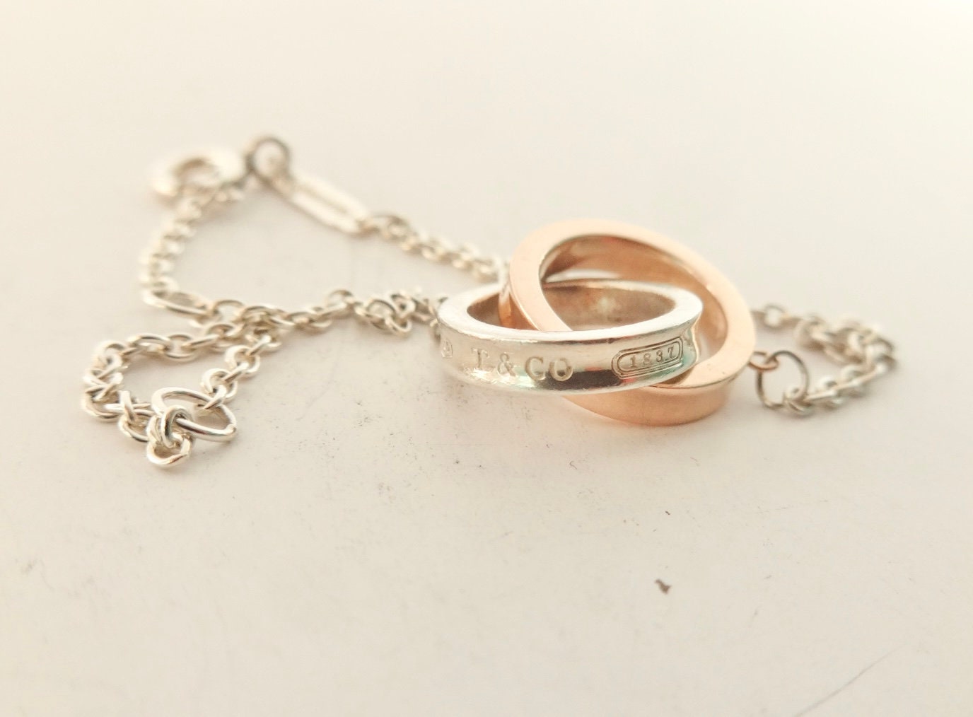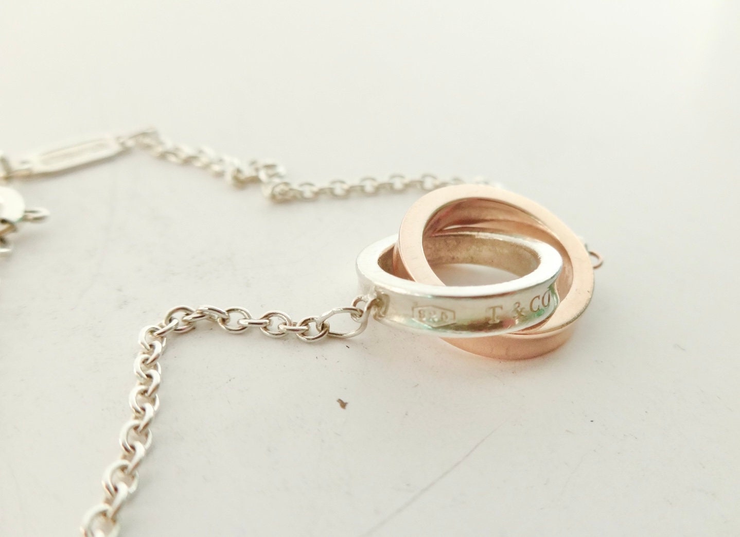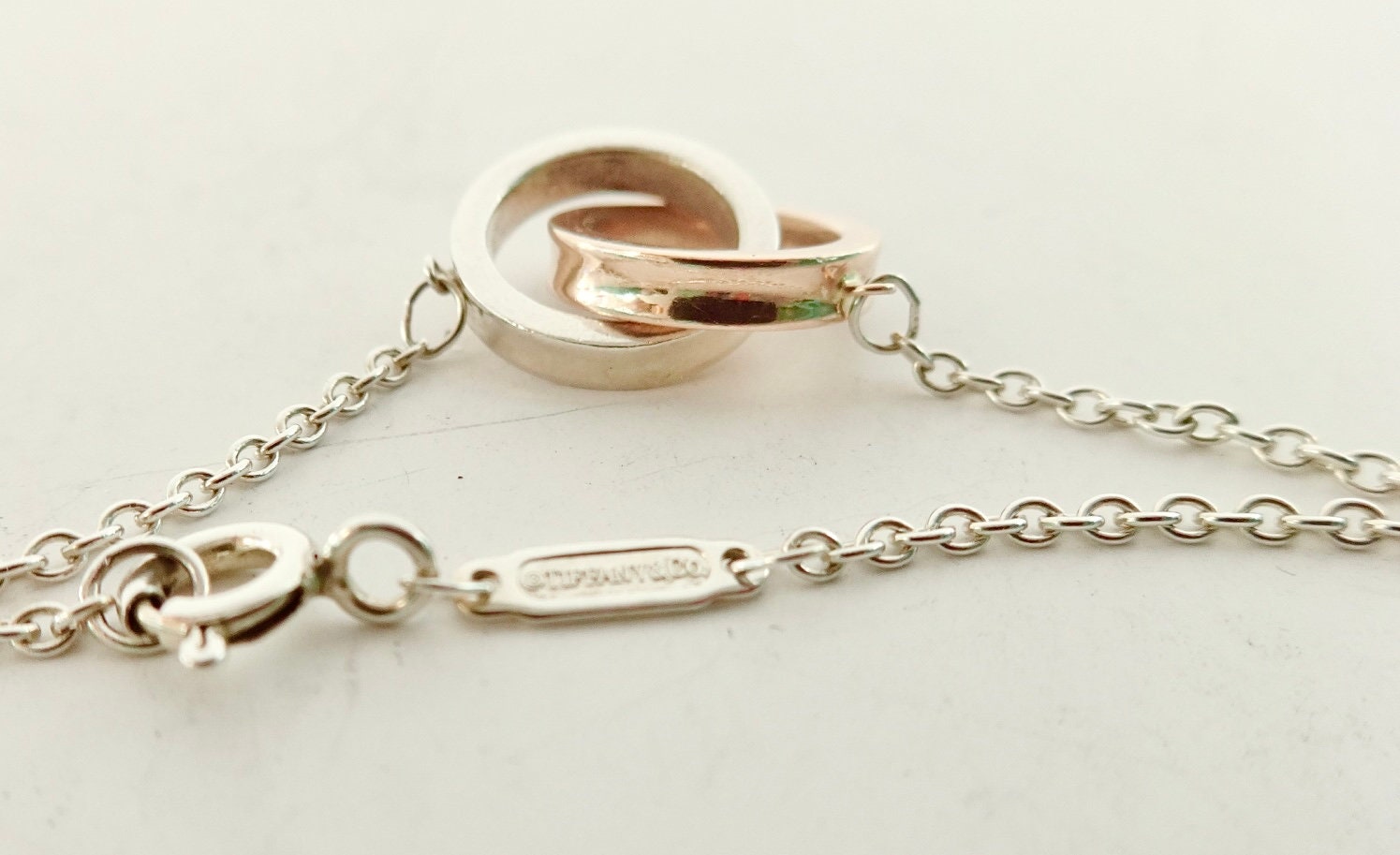 Authentic Tiffany & Co. sterling silver Rubedo interlocking circles pendant adjustable size bracelet. The bracelet consists of two interconnected round rings, one is silver the other is Rubedo, and they each measure approximately 1/2 inch across. On the edge of the silver ring it's marked 925 T&Co 1837. On the edge of the Rubedo ring it's marked NY T&Co 1837, the inside of the ring is marked Metal. The bracelet is adjustable, in that it has three different locations to attach the clasp. The sizes are 5.75 inches, 6.25 inches and 6.75 inches long. The bar on the chain is marked @Tiffany & Co. on one side and AG925 on the other side. Comes in the blue Tiffany dust bag pouch pictured, Tiffany box available for an additional fee. Very good condition, see pictures of actual item. If you have any questions, please ask. Thank you.