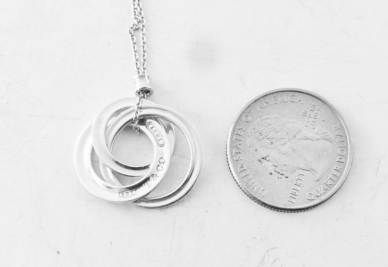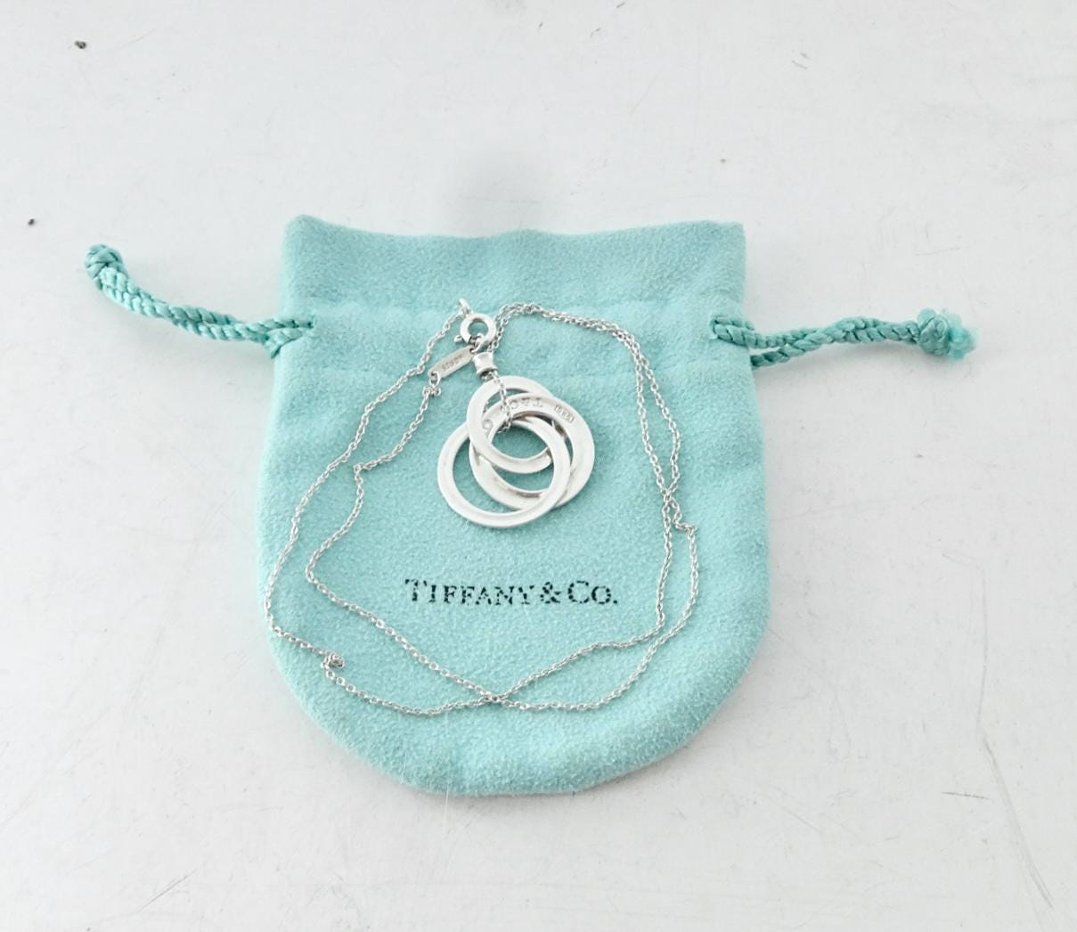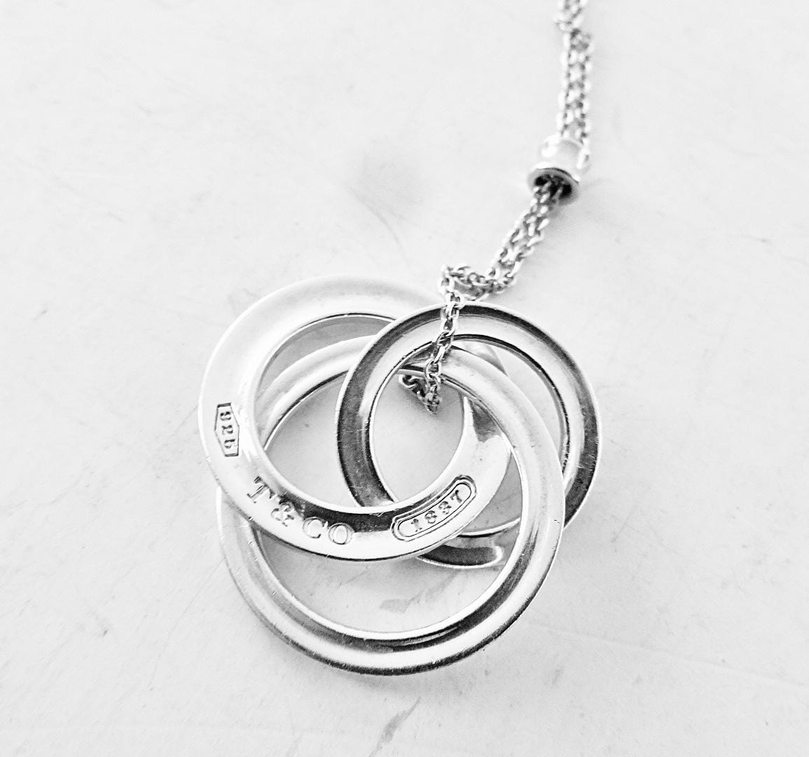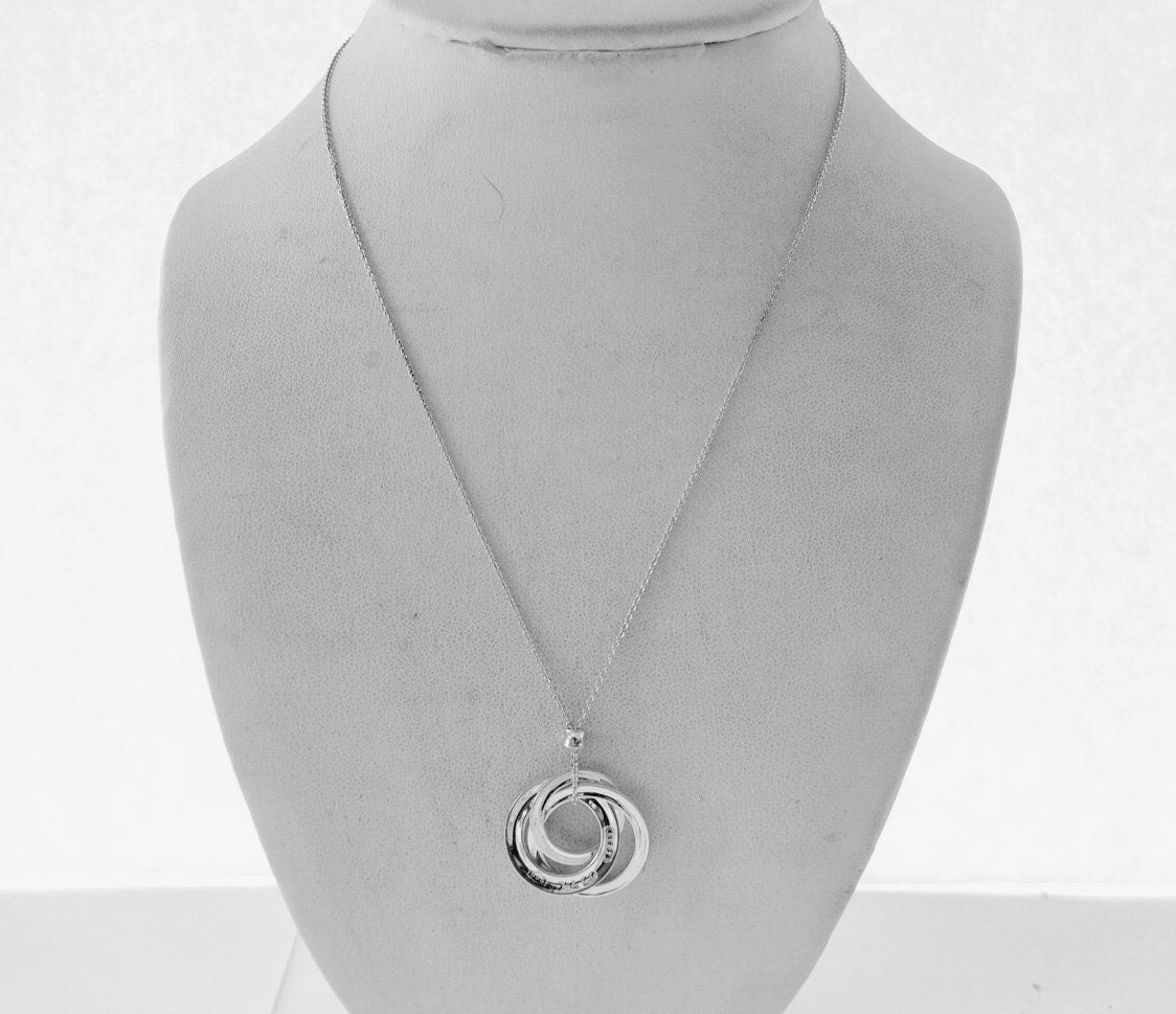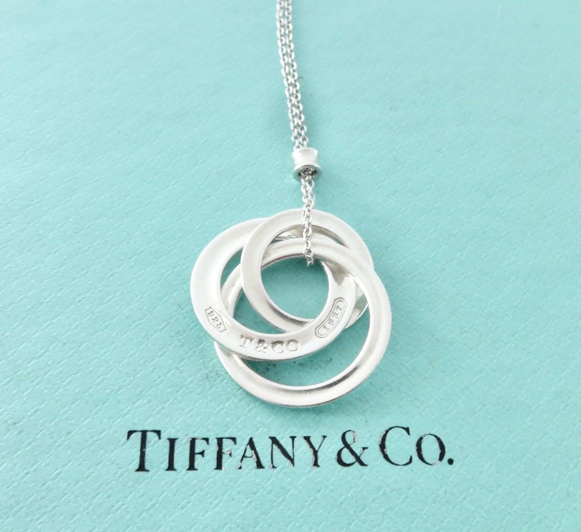 Authentic Tiffany & Co. sterling silver interlocking circles pendant size small on an 18 inch Tiffany chain. The necklace consists of three interconnected round rings, in 3 different sizes. On one of the rings, the front is marked 925 T&Co 1837 and the back is marked ©T & Co. AG925. The chain measures approximately 18 inches long and one side of the bar on the chain is marked @Tiffany & Co. The other side of the bar is marked AG925. Comes in the blue Tiffany dust bag pouch pictured, box sold separately. Very good condition, see pictures of actual item. If you have any questions, please ask. Thank you.