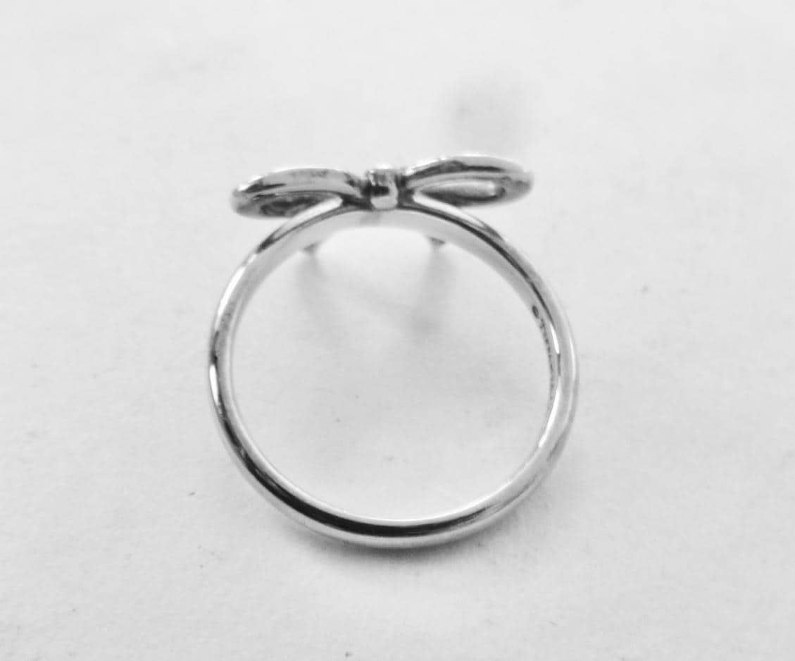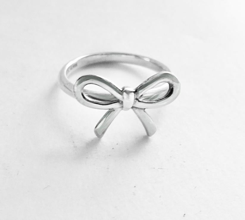 Authentic Tiffany & Co. sterling silver bow ring size 5.5. The bow measures approximately 1/2 inch wide by 7/16 inches high, at the widest and highest points. The inside of the ring is marked ©Tiffany & Co. AG925 and the ring measures a size 5.5. Comes in the blue Tiffany dust bag pouch shown, Tiffany box available for an additional fee. Very good condition, see pictures of actual item. If you have any questions, please ask. Thank you.