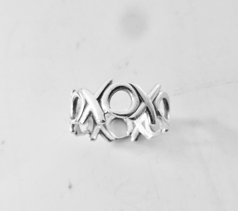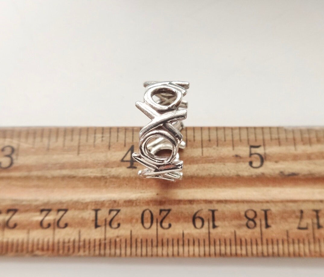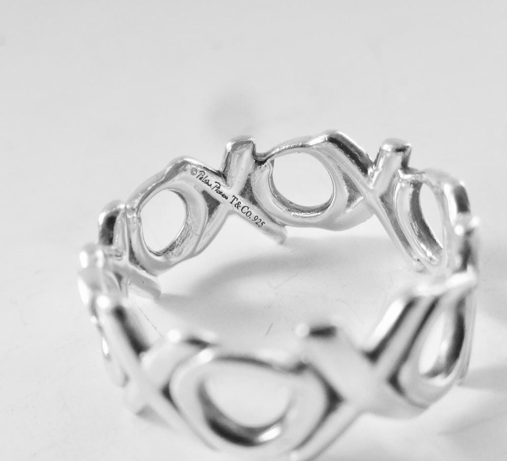 Authentic Tiffany & Co. Paloma Picasso graffiti Love & Kisses "XOXO" 925 sterling silver band ring size 5.5. The inside of ring is marked ©Paloma Picasso T&Co. 925. The ring has X's and O's all around the sides of the ring and it measures approximately 1/4 inch wide, at the widest, as the width varies depending on the letter. Ring size is a size 5.5 and is not adjustable. Very good condition, see pictures of actual item. Price includes the Tiffany & Co. dust bag pouch shown, Tiffany box available for an additional fee. If you have any questions, please ask. Thank you.