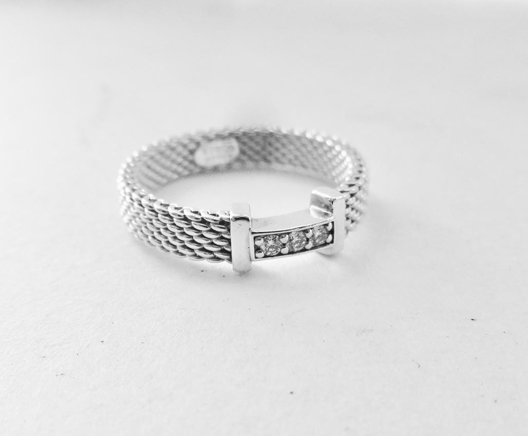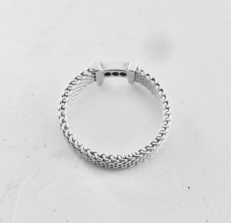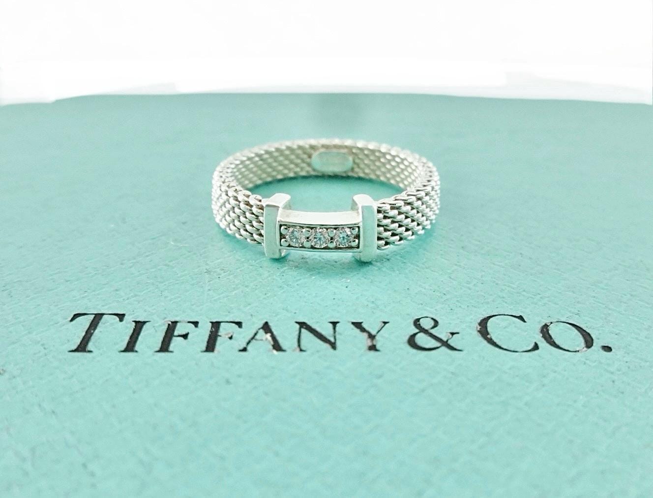 Authentic Tiffany & Co. Somerset mesh 925 sterling silver with 3 diamonds narrow band ring in size 6. The mesh part of the ring measures approximately 4mm wide and the bar, next to the channel set diamonds, measures approximately 5mm (3/8"). The inside of the ring is marked ©T&Co. 925 and the middle of the ring has three round brilliant diamonds. Very good condition, see pictures of actual item. Price includes Tiffany & Co. dust bag pouch shown. If you have any questions, please ask. Thank you.