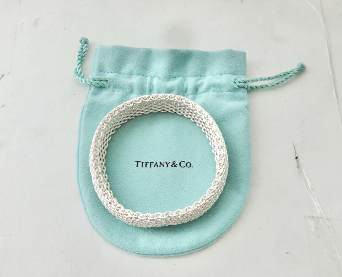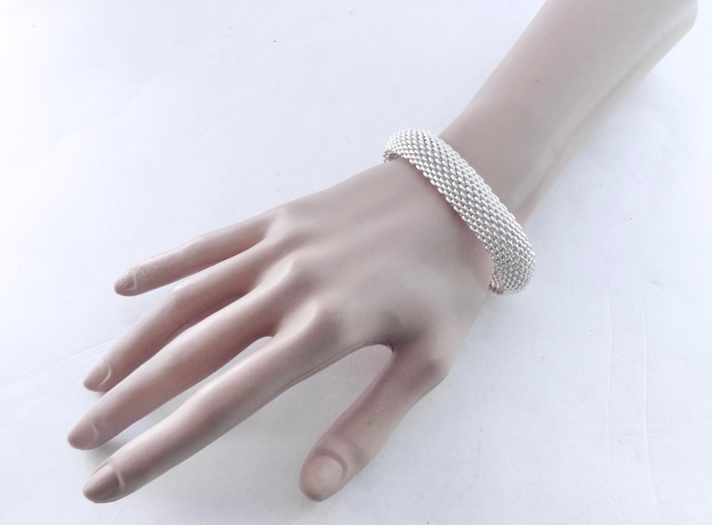 Authentic classic Tiffany & Co. Somerset mesh 925 sterling silver bracelet with approximately a 2.25 inch diameter and approximately a 7.25 inch circumference. The inside of the bracelet is marked Tiffany & Co. 925. The bracelet is approximately 1/2 inch wide, made of flexible mesh but will not stretch to accommodate a larger size. It will fit best on a 6.5 inch or smaller wrist. Very good condition, see pictures of actual item. Price includes Tiffany & Co. dust bag pouch shown, Tiffany box available for an additional fee. If you have any questions, please ask. Thank you.