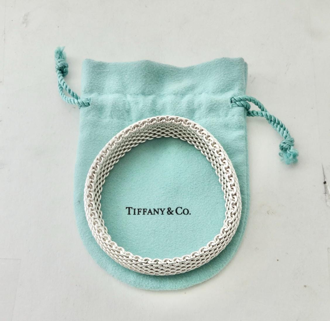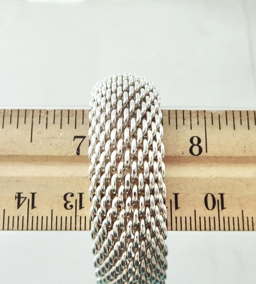 Authentic classic Tiffany & Co. Somerset mesh 925 sterling silver bracelet with approximately a 2.45 inch diameter and approximately a 7.75 inch circumference. The inside of the bracelet is marked ©Tiffany & Co. 925. The bracelet is approximately 1/2 inch wide and is made of flexible mesh but doesn’t stretch. It will fit best in an 7 inch or smaller wrist. Very good condition, see pictures of actual item. Price includes Tiffany & Co. dust bag pouch shown, box sold separately. If you have any questions, please ask. Thank you.