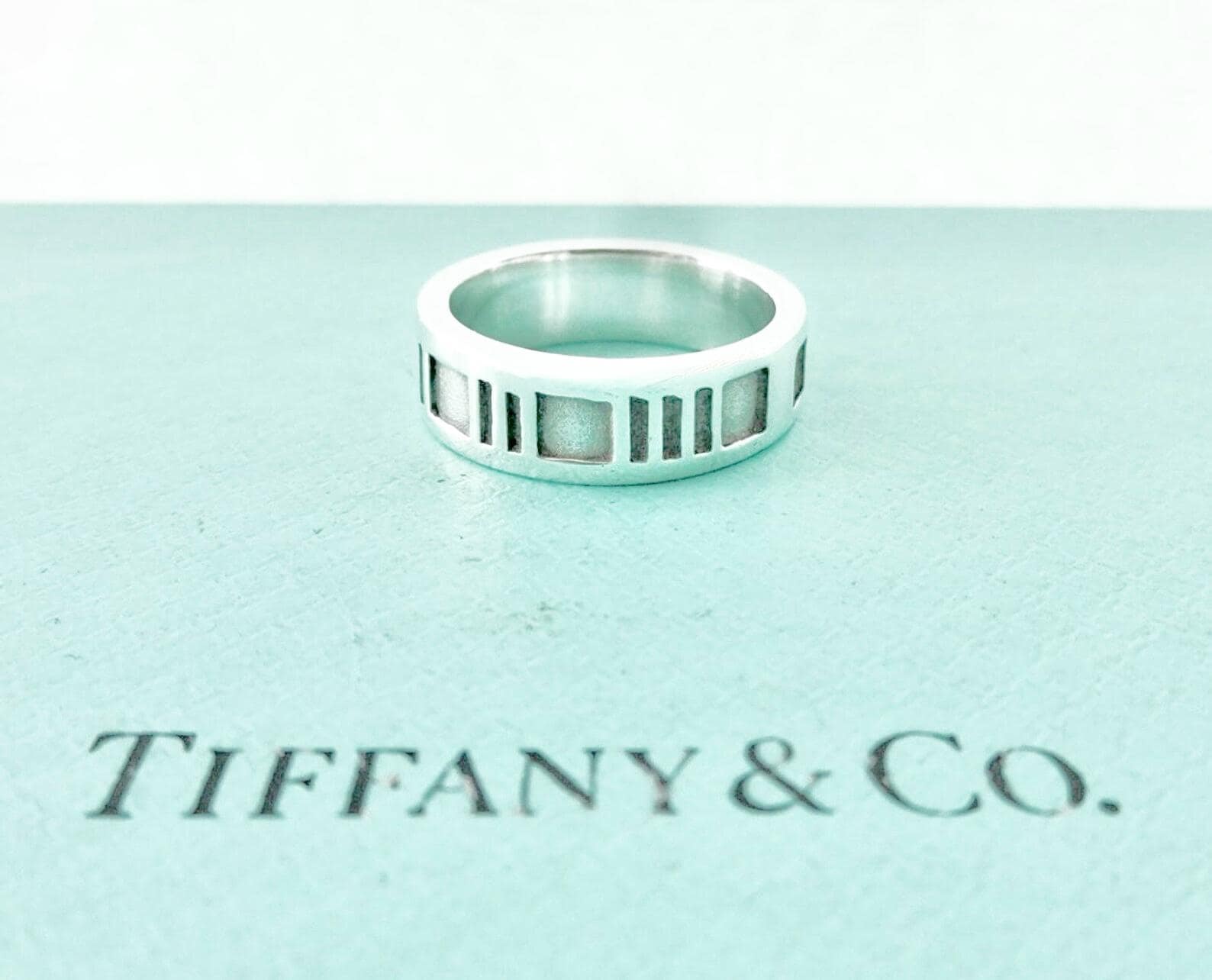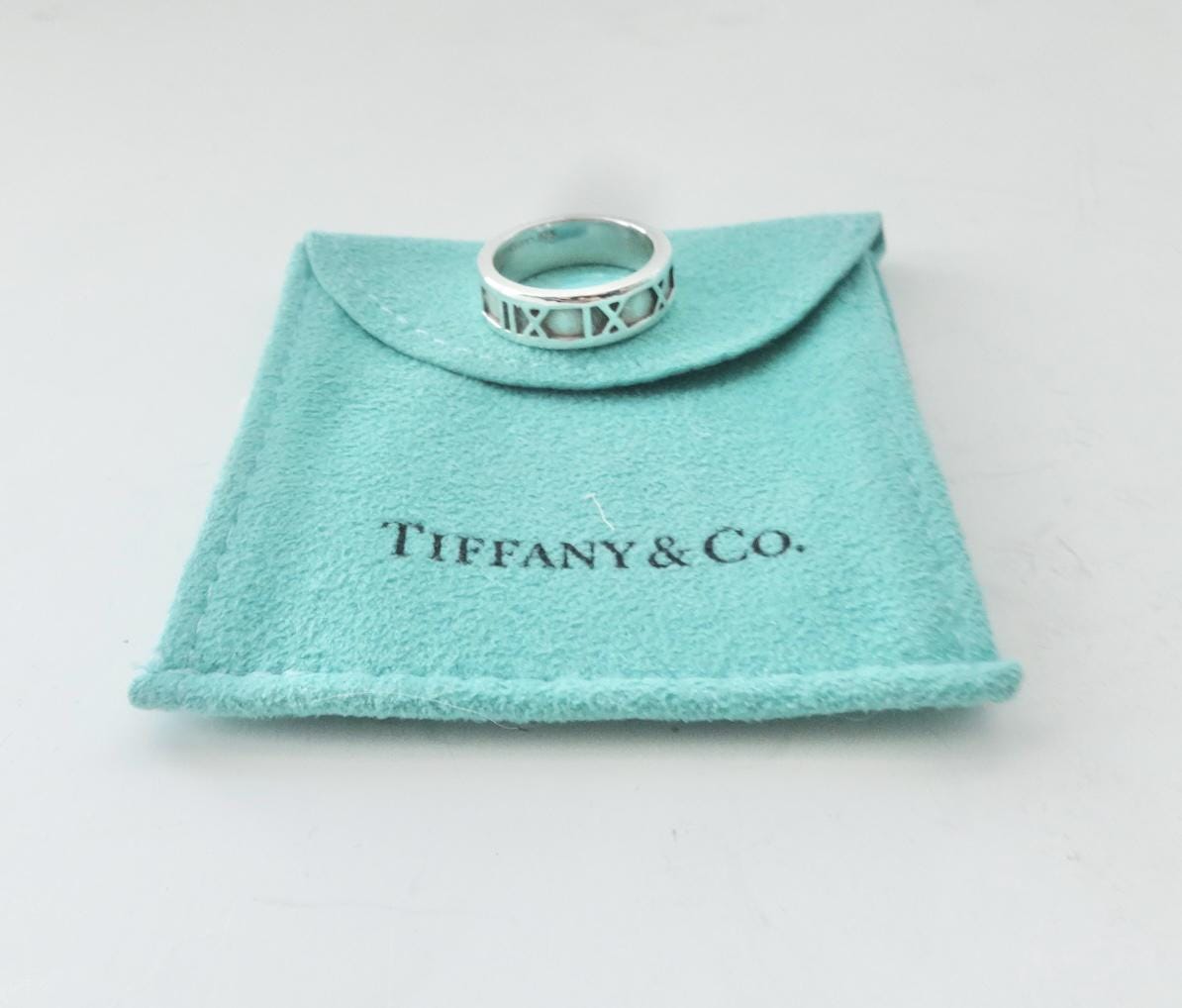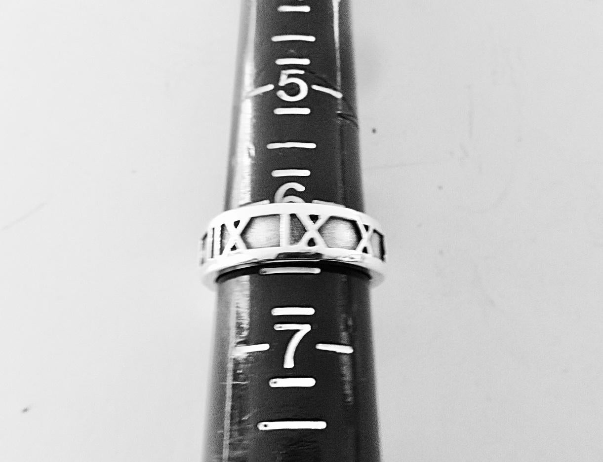 Authentic Tiffany & Co. sterling silver 925 Atlas narrow band ring in size 6.25. The ring measures approximately 1/4 inch wide and around the ring are the following roman numerals, I II III IIII IX X XI XII. The inside of the ring is marked Tiffany & Co.©1995 925. The ring measures a size 6.25 and because of the design, the size is not adjustable. Very good condition, see pictures of actual item. Price includes Tiffany & Co. dust bag pouch shown, Tiffany box available for an additional fee. If you have any questions, please ask. Thank you.