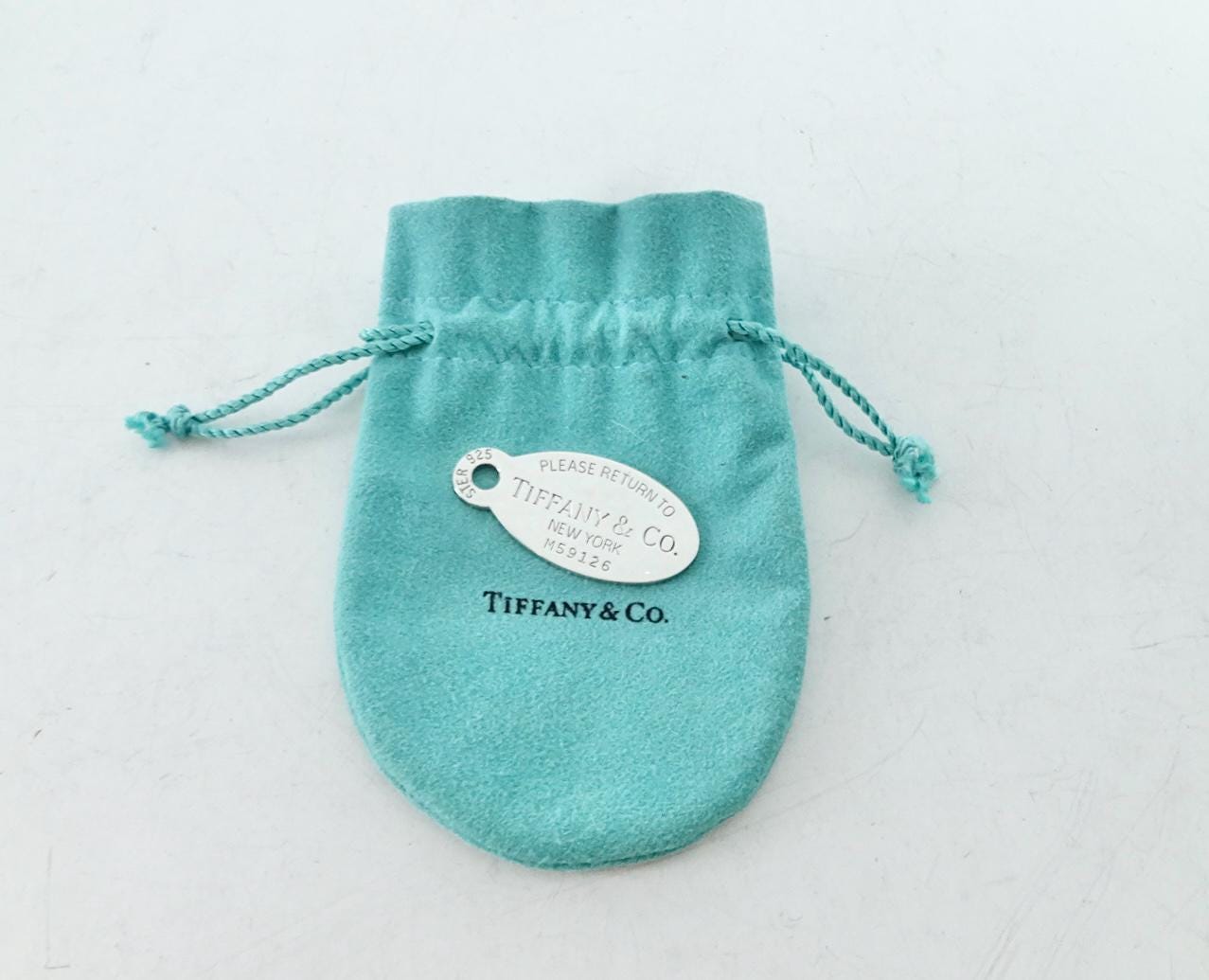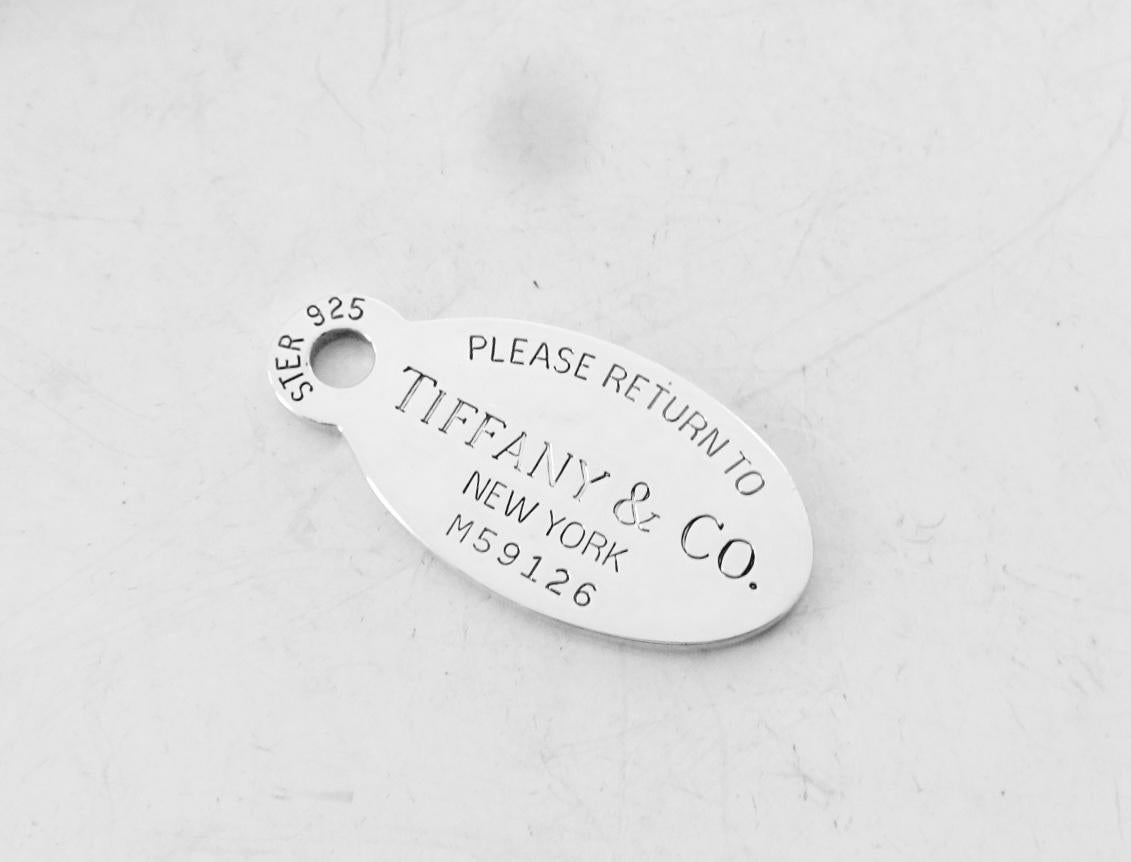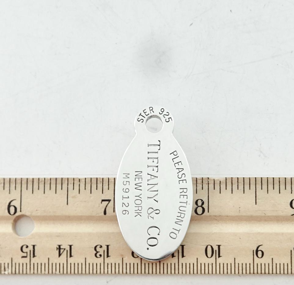 Authentic Tiffany & Co 925 sterling silver large Please Return to Tiffany oval dog tag pendant. The front of the pendant is marked Please Return to Tiffany New York M59126 and the bail is marked Ster 925. The back of the pendant is blank. The pendant measures approximately 1 3/4 inches long by 7/8 inches wide, at the longest and widest points. Very good condition, please see pictures of actual item. Price includes Tiffany & Co. dust bag pouch shown, Tiffany box available for additional cost. If you have any questions, please ask. Thank you.
