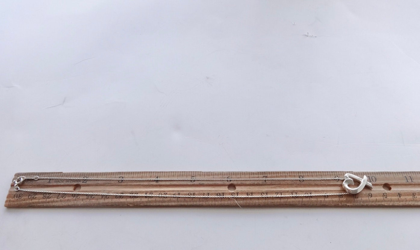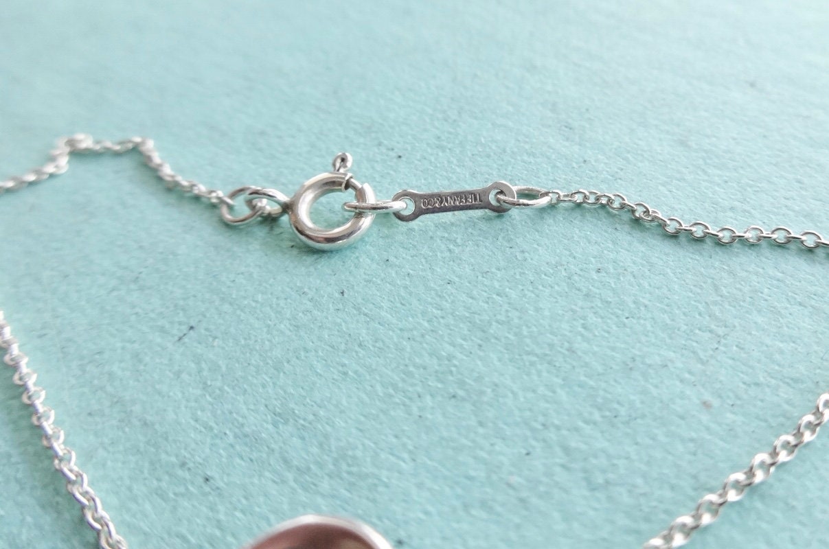 Authentic Tiffany & Co. Paloma Picasso sterling silver medium sized loving heart pendant necklace. Pendant is approximately 5/8 inches wide by 7/8 inches long at the widest points. The heart is strung on two Paloma Picasso chains, with an overall necklace length of 18 inches. The back of the pendant is stamped Tiffany & Co. ©Paloma Picasso 925. The bar on the chain is stamped Tiffany & Co. on one side and Paloma Picasso on the other side. The clasp on the chain is marked 925. Quarter not included in sale, used only to show size. Comes in the blue Tiffany dust bag pouch pictured, Tiffany box available for an additional fee. Very good condition, see pictures of actual item. If you have any questions, please ask. Thank you.