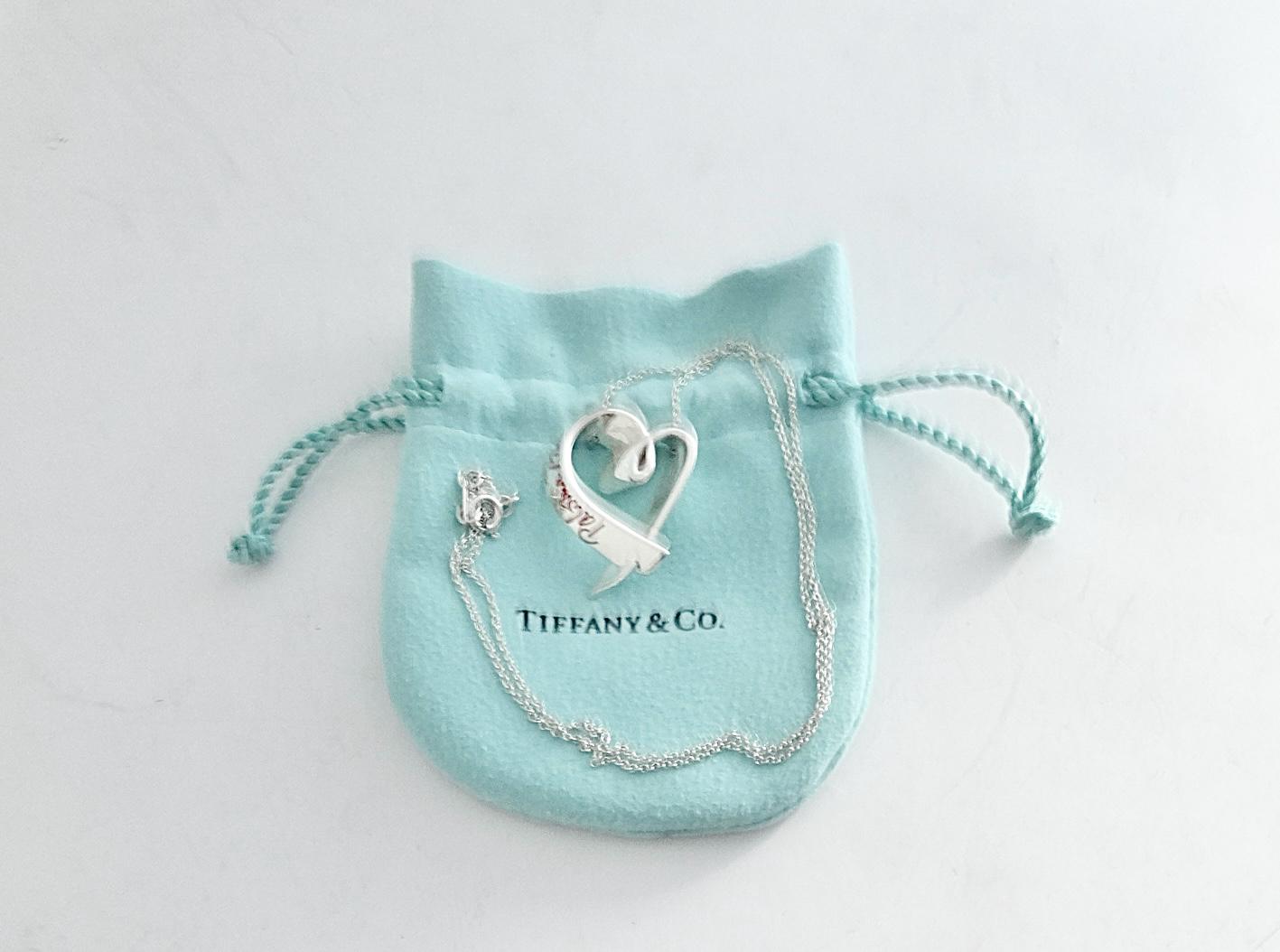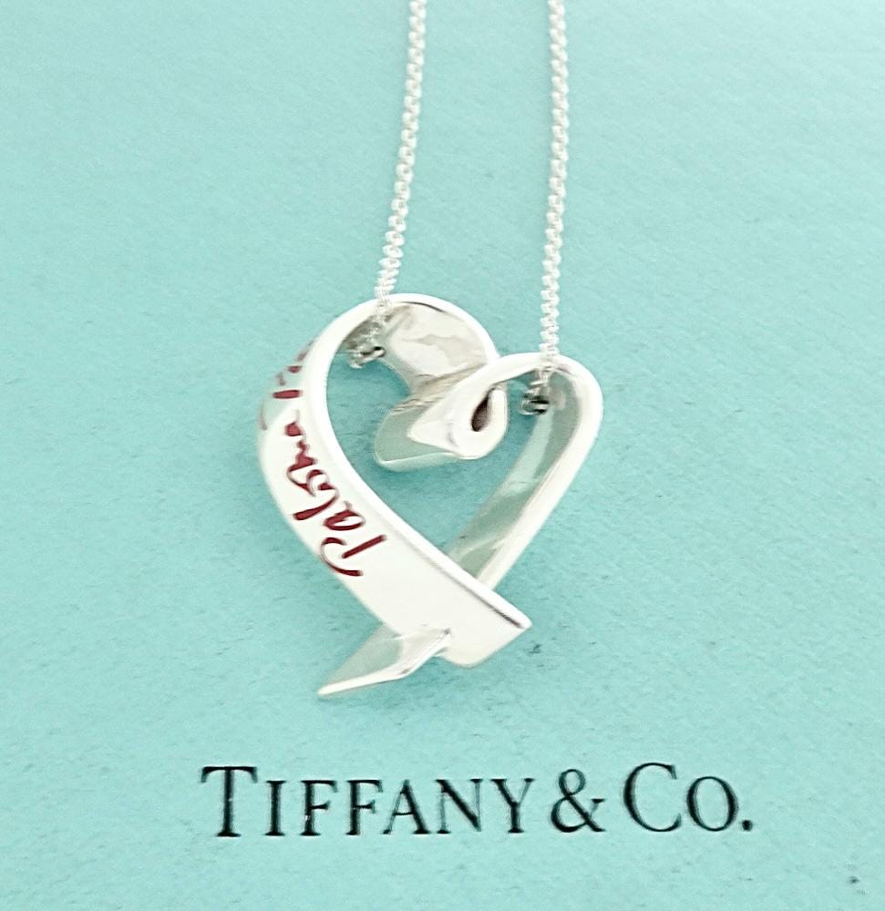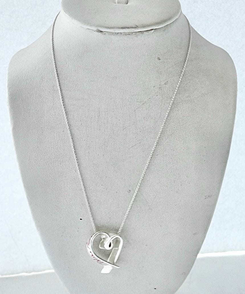 Tiffany & Co. Paloma Picasso Graffiti sterling silver and red enamel authentic loving heart large pendant necklace. The heart pendant is approximately 7/8 inches wide by 1 1/8 inches long by 1/4 inch deep, at the widest, longest and deepest points. The side of the heart has the words "Paloma Picasso" written in red enamel script. The chain is approximately 17 inches long and the overall necklace length is approximately 18 inches. The bar on the chain is stamped T&Co. AG925 on one side and ©Paloma Picasso on the other side. Great condition, see pictures of actual item. Price includes the Tiffany & Co. dust bag pouch shown, box sold separately. If you have any questions, please ask. Thank you.